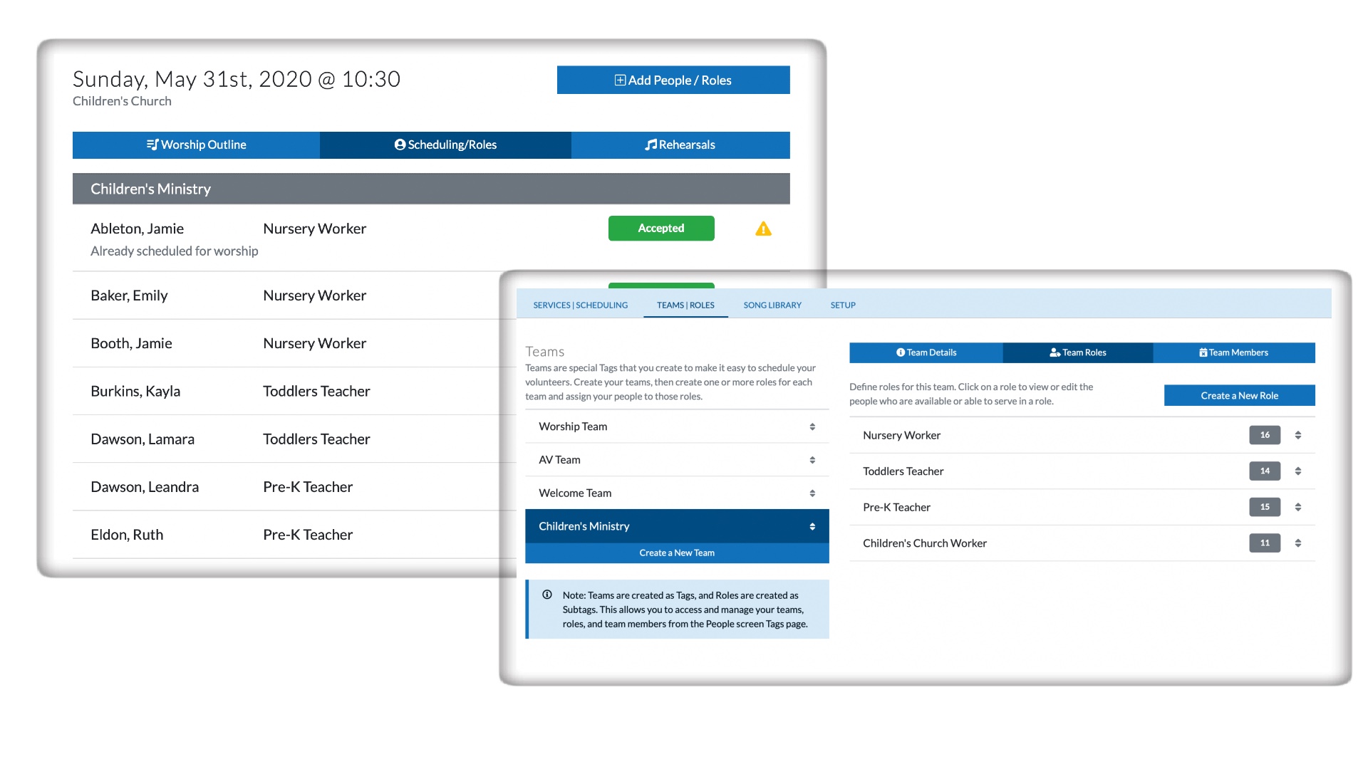 Create teams for every ministry. When you create a team, a Team Tag is automatically created. This makes scheduling super fast and easy. Within each Team, you can create and assign various Roles to each of your people. Each Role that you create is a Sub-Tag for the Team it's created under. Depending on the needs of your church/ministry, you can make as many Teams & Roles as you'd like. Learn more about Teams & Roles