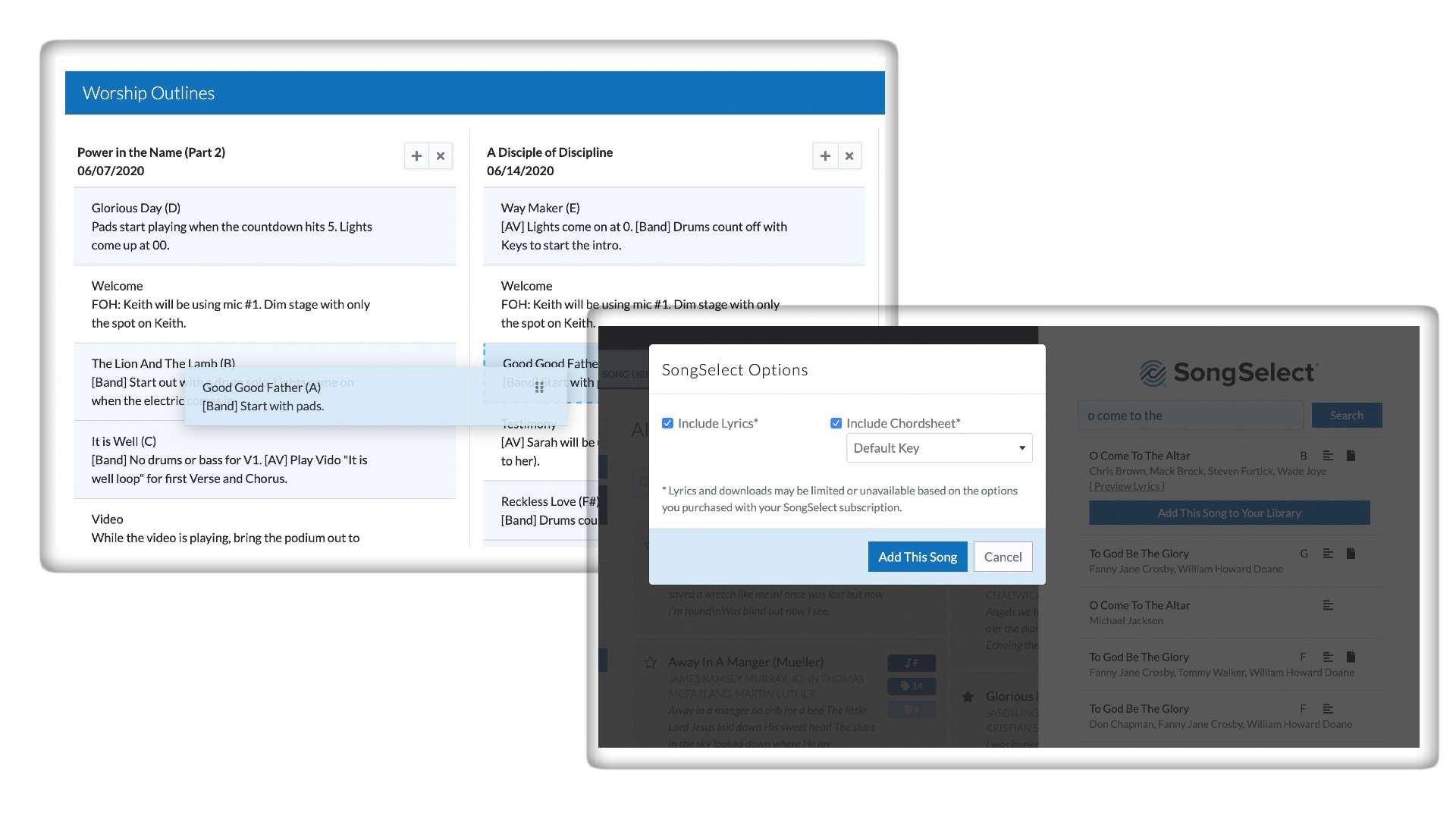 Worship Outlines consist of Service Elements and Songs. For each Service Item, you can designate its time, add notes, designate a leader, and more. Each element can be rearranged and deleted at any time. You can also create a template from any service of your choice to make worship planning even quicker for the future.